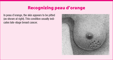Women can have nipple discharge for a variety of reasons, some related to elevated prolactin levels or even a pituitary tumor, but never NEVER ignore a bloody nipple discharge. And if the skin of your breast looks and feels like an orange peel, see a doctor immediately. Peau-de-orange is a classic sign of Paget’s breast disease.