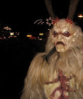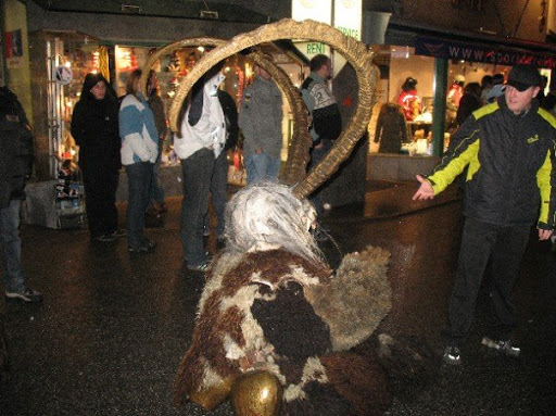 Krampus sometimes carries a basket on his back to carry away bad children. Quite the contrast to Santa and his sack of toys!