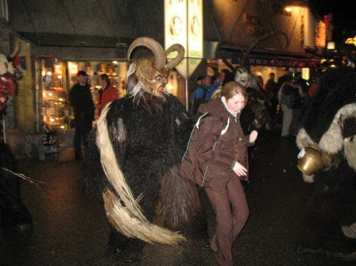 Krampus festivals are traditionally held during the first two weeks of December. Young men dress up in goat furs, horns and masks and roam the streets frightening children and women with rusty chains and bells. They also use a birch branch to switch young girls.