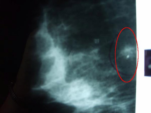 Yes, I was 6 months late getting my mammogram, but I had no pain, no lumps, no family history, and no reason to be concerned. Until I saw that Right CC. There, next to my chest wall on the inside of my right breast was a star-shaped lesion with a large calcification in the center. That same lesion was evident on the RMLO (right medial-lateral obligque image–the one taken from the side.) But it was the Friday before Father’s Day and the radiologist had already gone home. So, I had all weekend to worry about that lesion. And suddenly, I had a BIG reason for concern. I’m not a doctor or radiologist, but I’d seen enough mammograms and enough cancers in my time to know that lesion didn’t look good.